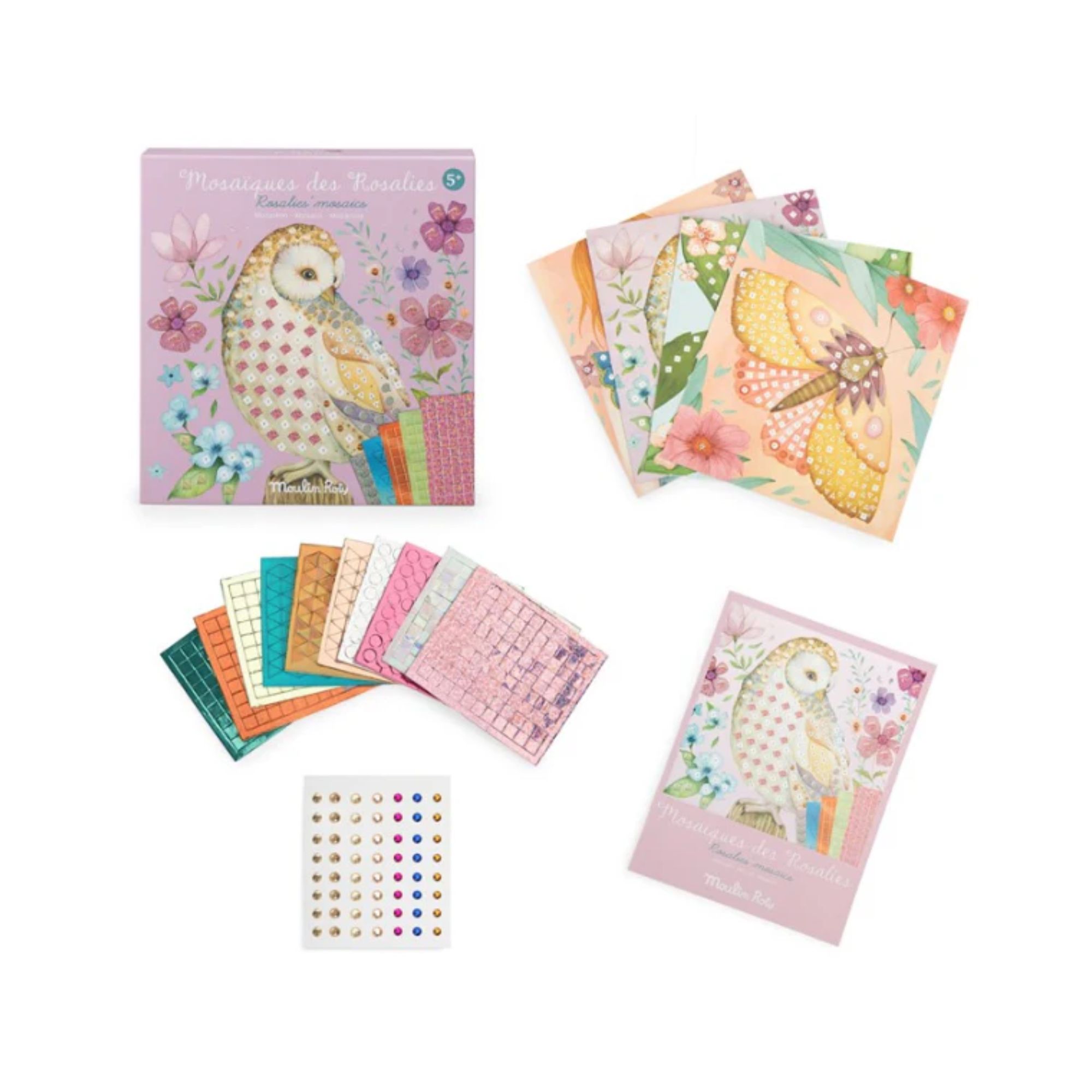 ¡Sumérgete en el mágico mundo de las Rosalies ! Con el set de mosaicos Moulin Roty, los niños podrán crear sus propias obras de arte y dar rienda suelta a su creatividad. El set incluye 5 preciosas tarjetas ilustradas , 10 láminas de pegatinas de mosaico y 1 lámina de gemas brillantes para que cada obra de arte resplandezca.