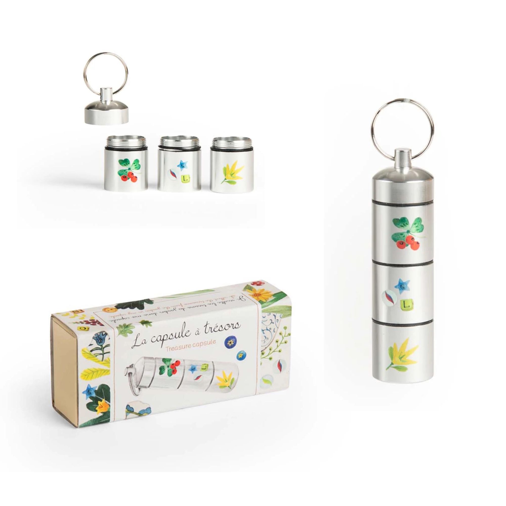 ¡Una fantástica cápsula metálica dividida en tres prácticos compartimentos para guardar y llevar a casa todos los pequeños tesoros que tu peque encuentre en sus aventuras al aire libre! Simplemente desenrosca los compartimentos y guarda dentro pequeñas semillas, piedras preciosas o bonitas conchas… Incluye una presilla para sujetarla a la mochila.