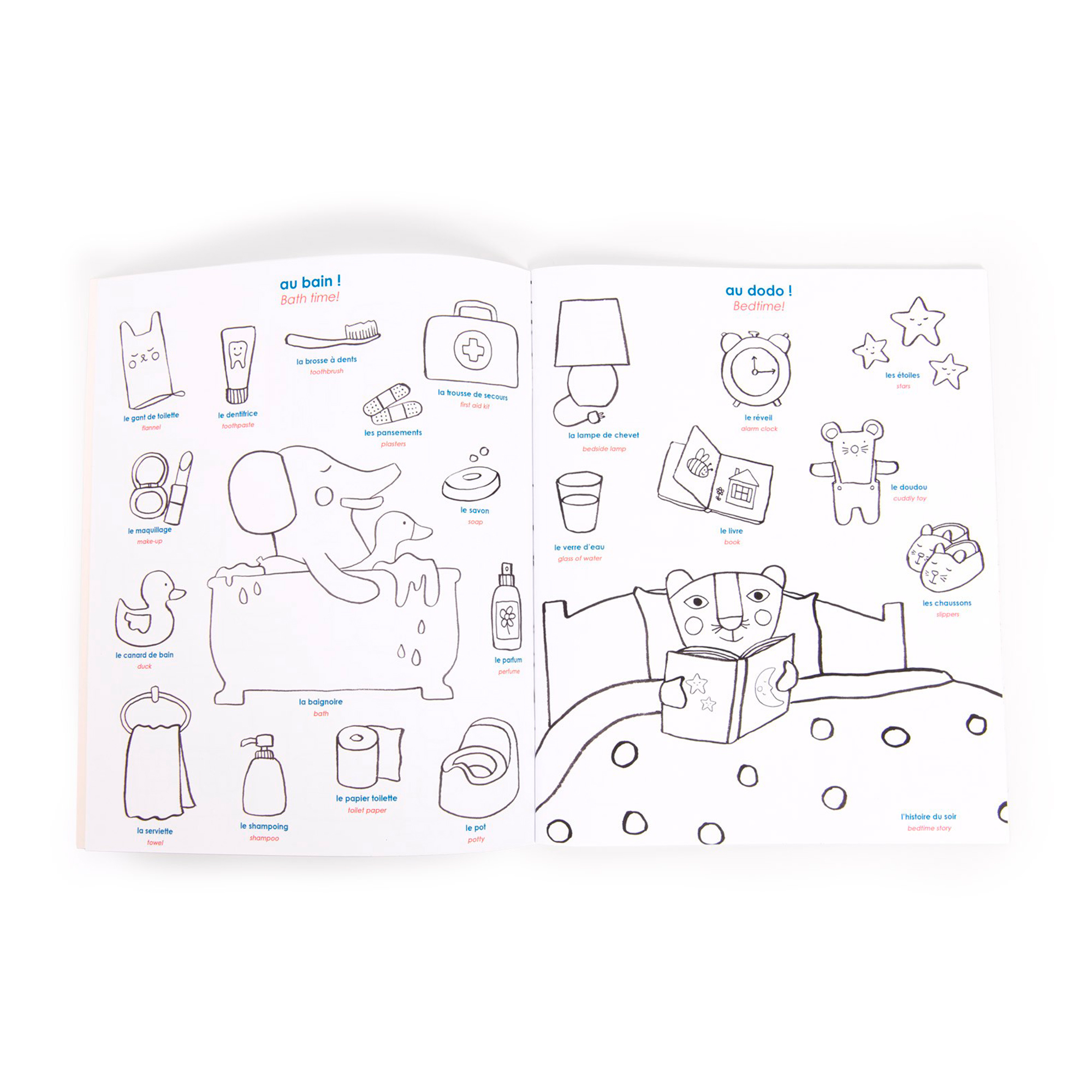 Cuaderno de 28 páginas en francés e inglés para colorear con actividades y pegatinas. Perfecto para que tu peque aprenda palabras de la vida cotidiana mientras se divierte, acompañado de los alegres y coloridos personajes Popipop.