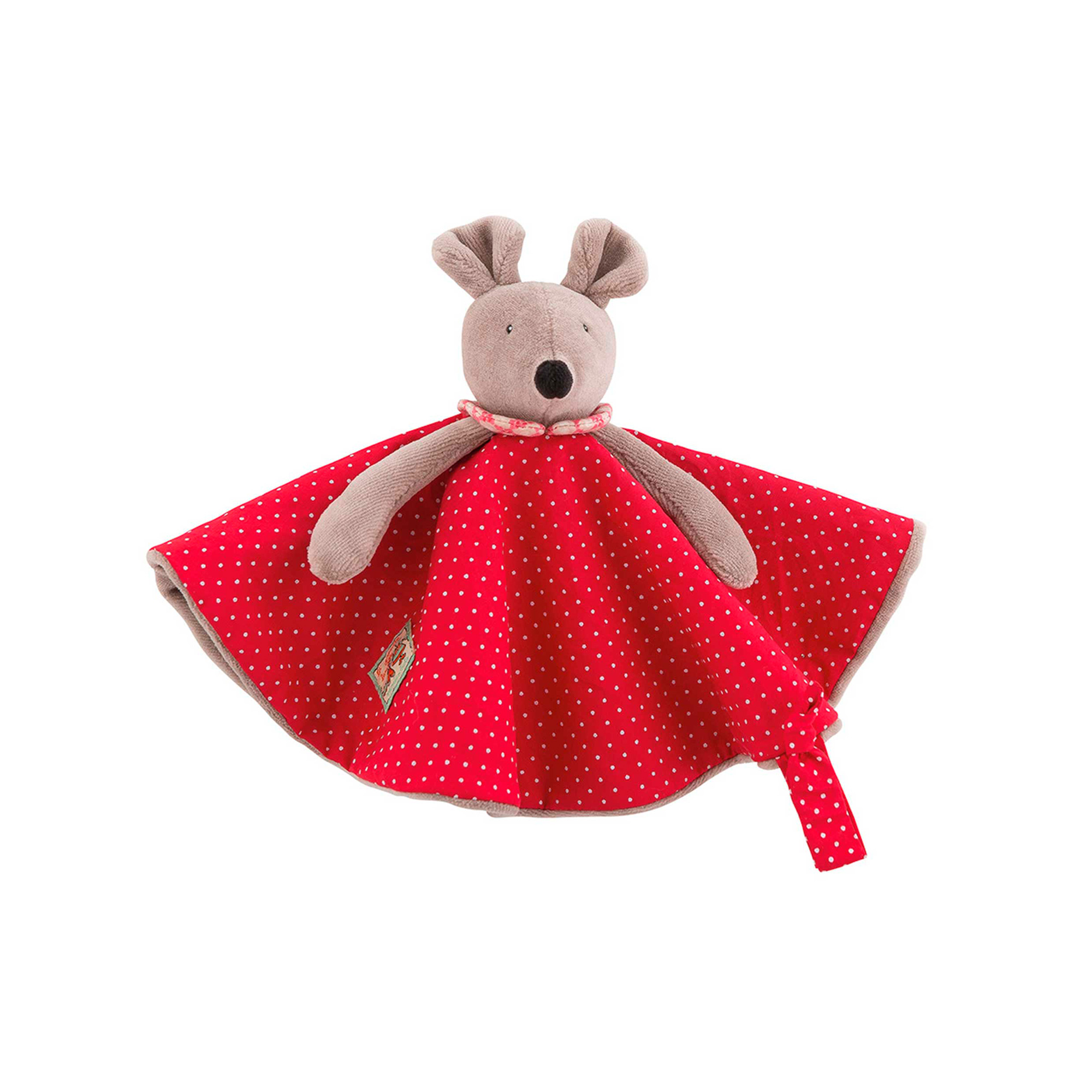 Nini la ratita en trapito de apego. Sigue siendo tan dulce y elegante, naturalmente encontramos su hocico puntiagudo, sus orejas pequeñas y su bonito vestido rojo con lunares blancos. Su tamaño permitirá que el bebé lo lleve consigo a todas partes.