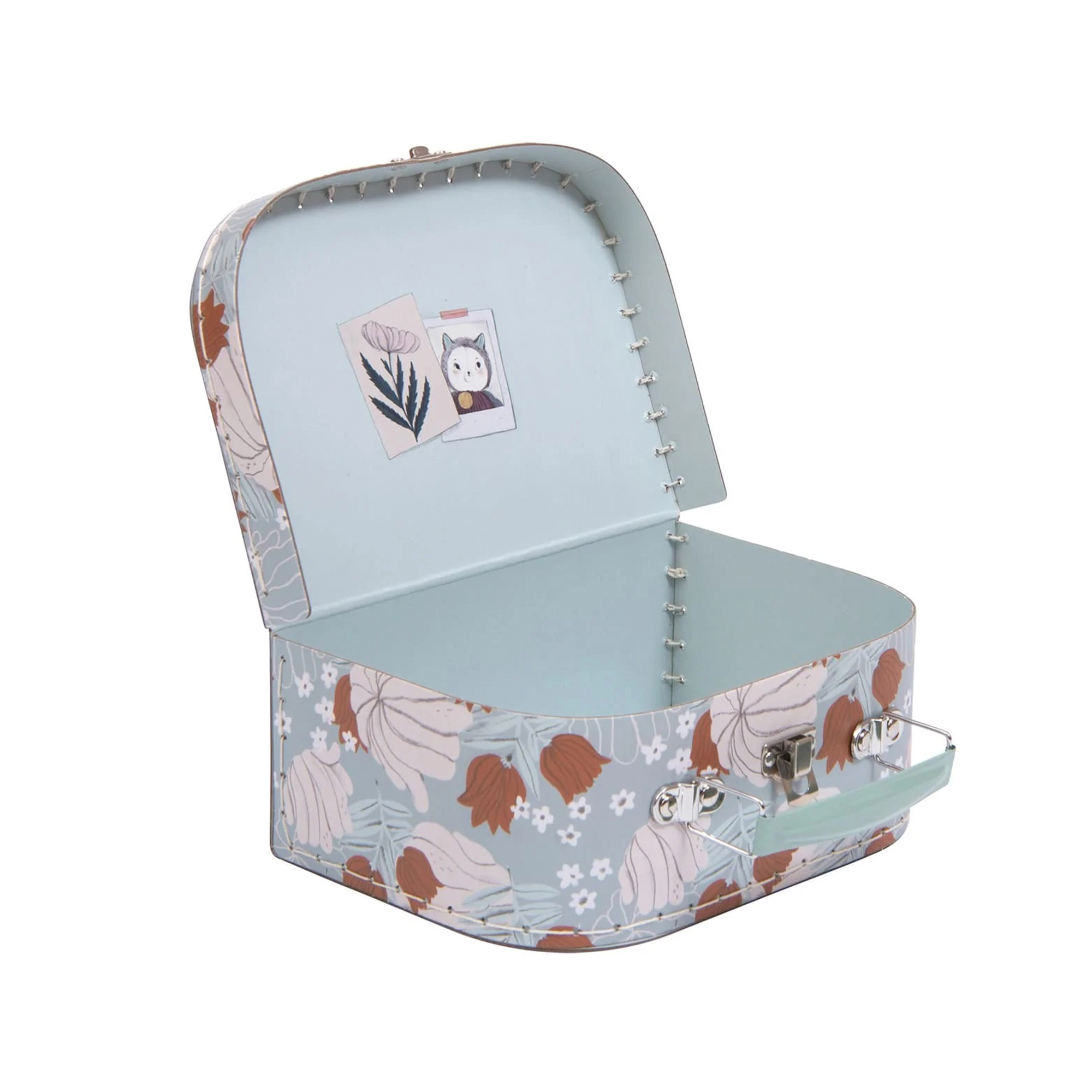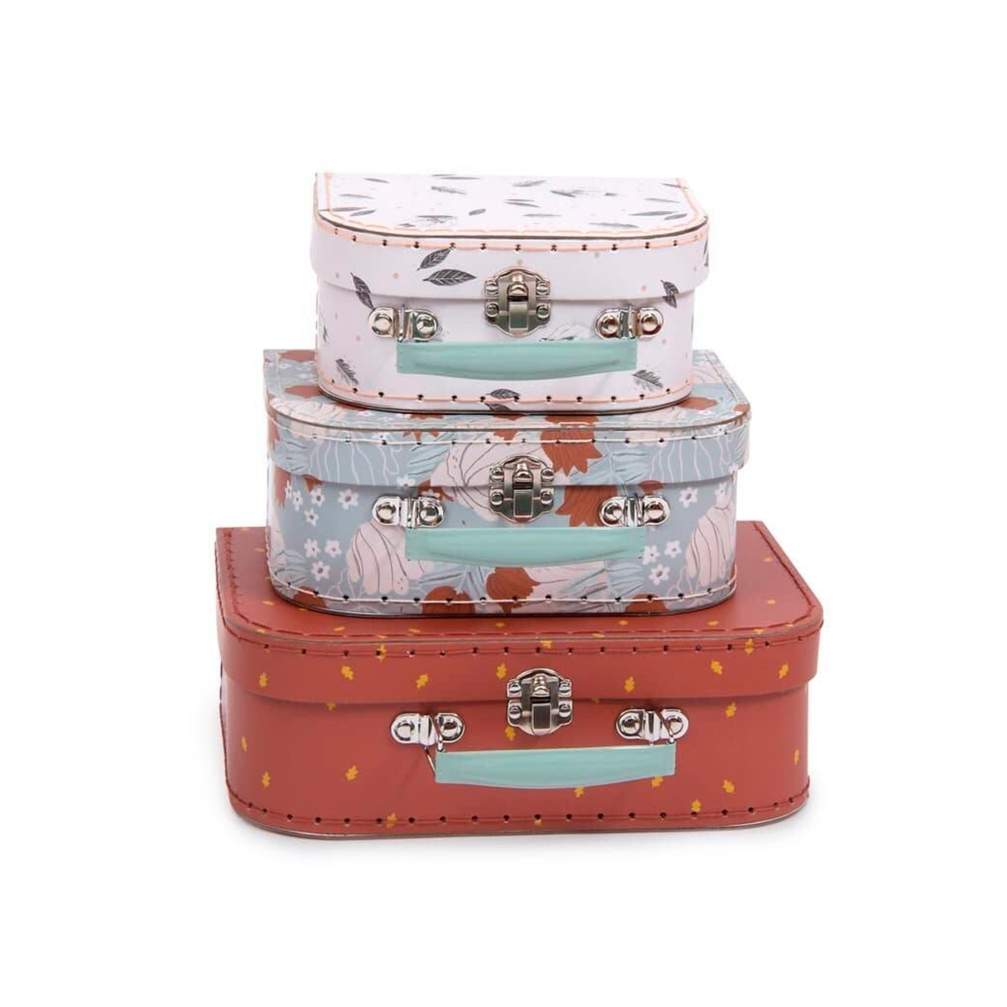 Cada maleta está hecha de cartón resistente con cierre y asa de metal. La maleta más grande es de color óxido y presenta algunos personajes adorables de Après La Pluie. Las otras dos maletas están decoradas con hojas en estilo otoñal.
