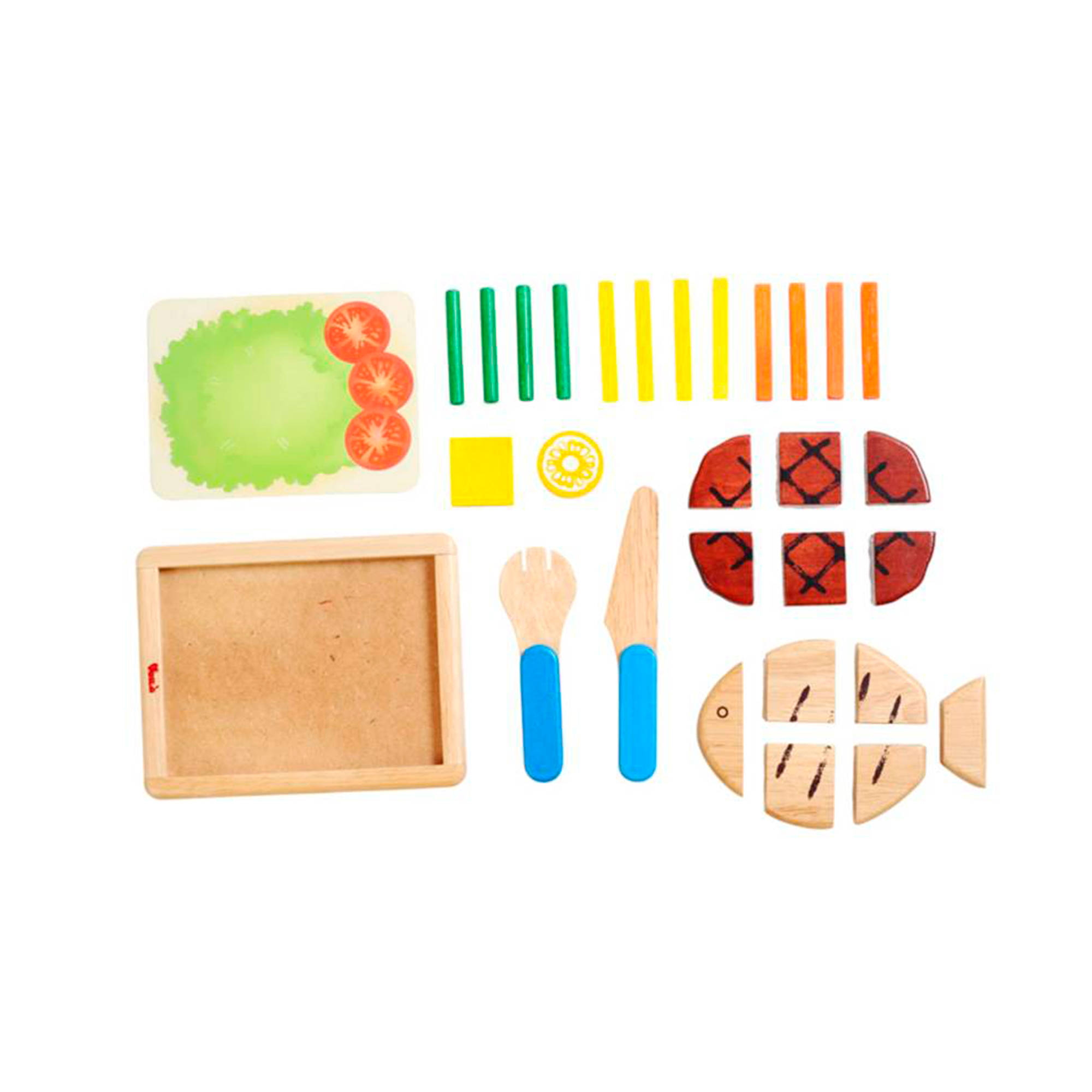 Es un conjunto de piezas de madera que simulan un bistec con ensalada y pescado frito, cuenta con accesorios.