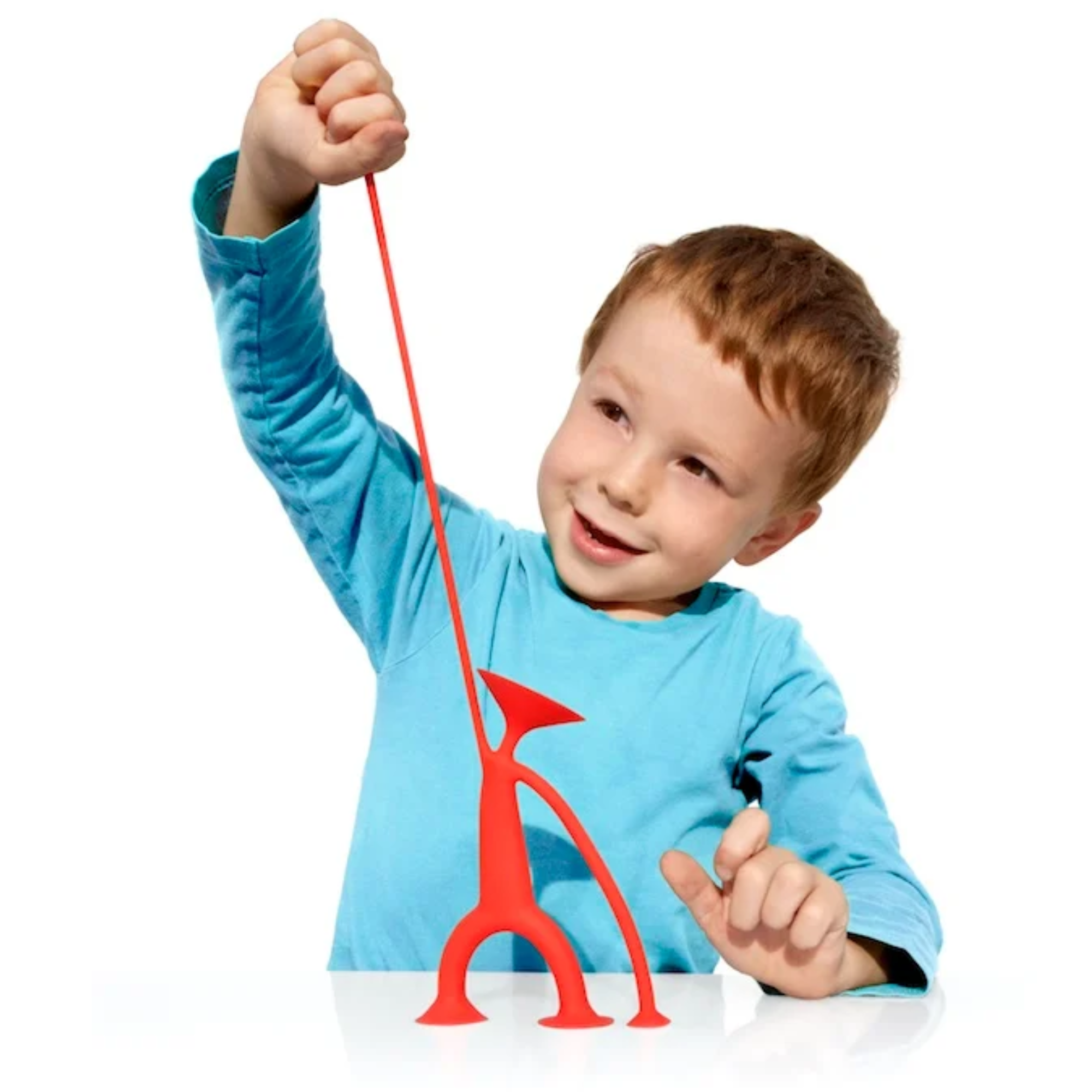 Juguete original de diseño suizo. Con brazos, piernas y cabeza súper estirables y con chupones para adherirse a superficies lisas como vidrios, espejos, mayólica, etc.