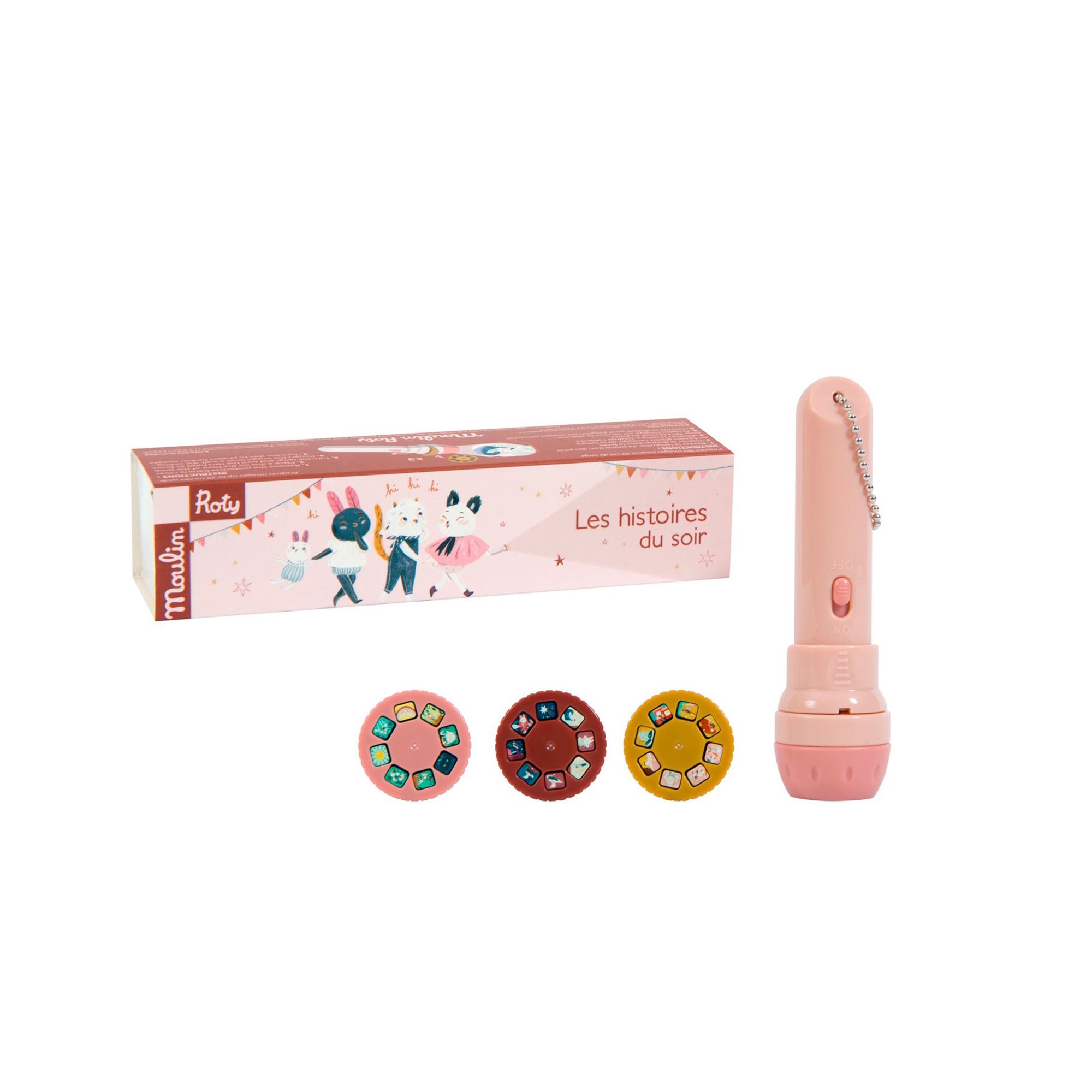 Para compartir momentos mágicos antes de dormir dejando volar la imaginación… he aquí la nueva linterna de Moulin Roty, con 3 historias protagonizadas por los tiernos personajes de la colección que inspiran mil y una historias que contar. Apaga las luces, inserta el disco dentro de la linterna, regula la nitidez de la imagen haciendo girar la lente delantera, proyecta las imágenes dónde quieras… ¡y qué empiece la magia!