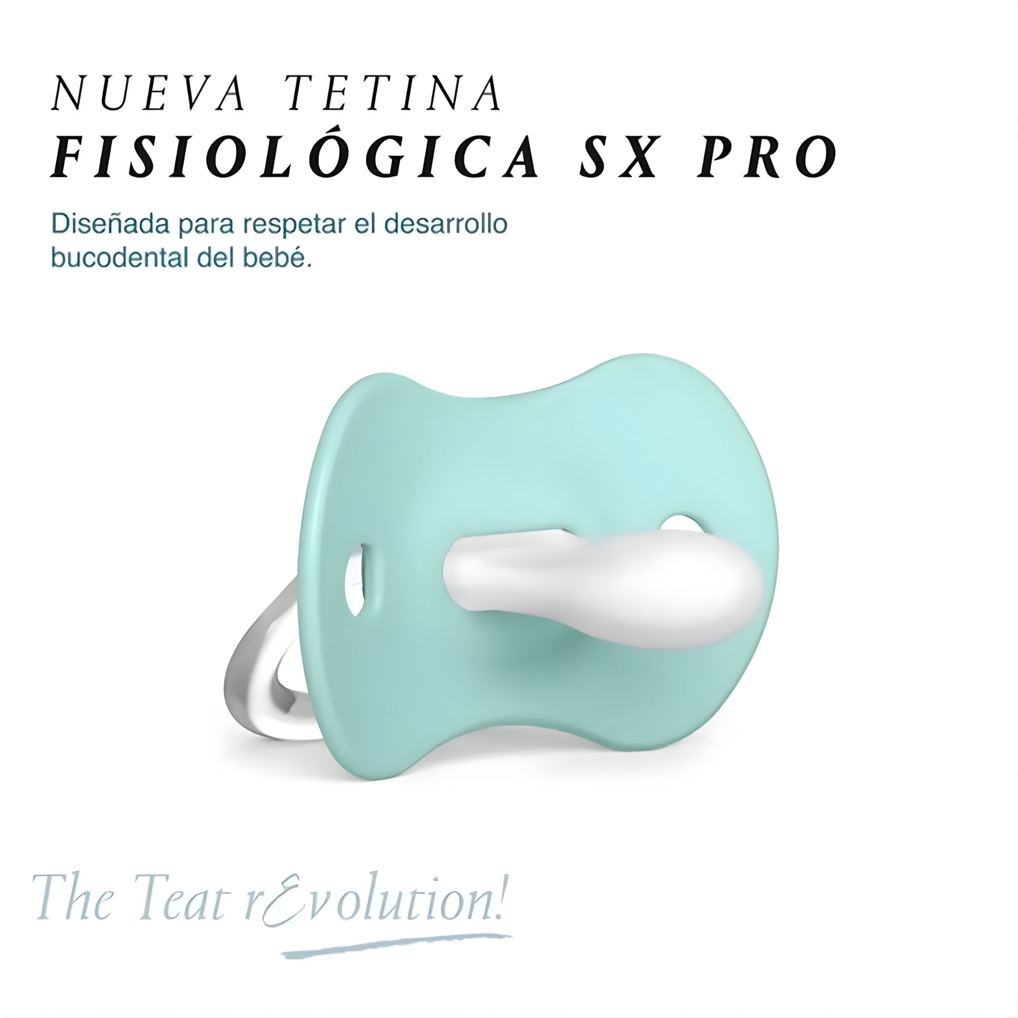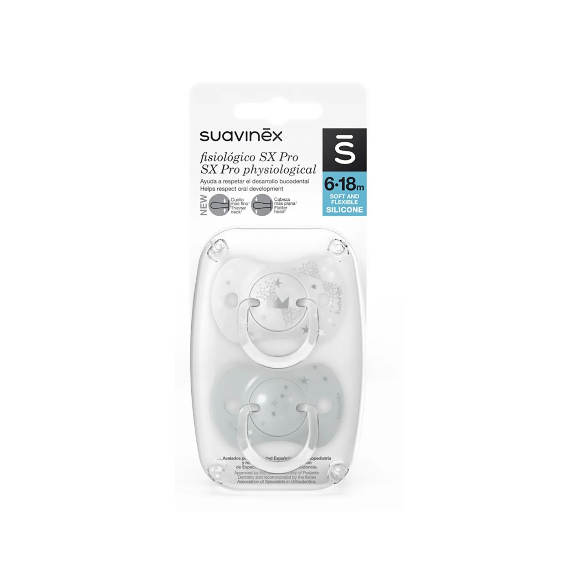 Chupones con tetina fisiológica SX Pro, para no invadir la cavidad oral y proporcionar al bebé la misma sensación que experimenta en su estado natural/fisiológico cuando no lleva chupete. Diseñado para respetar el desarrollo bucodental del bebé. Arandela con forma simétrica y tamaño más reducido.