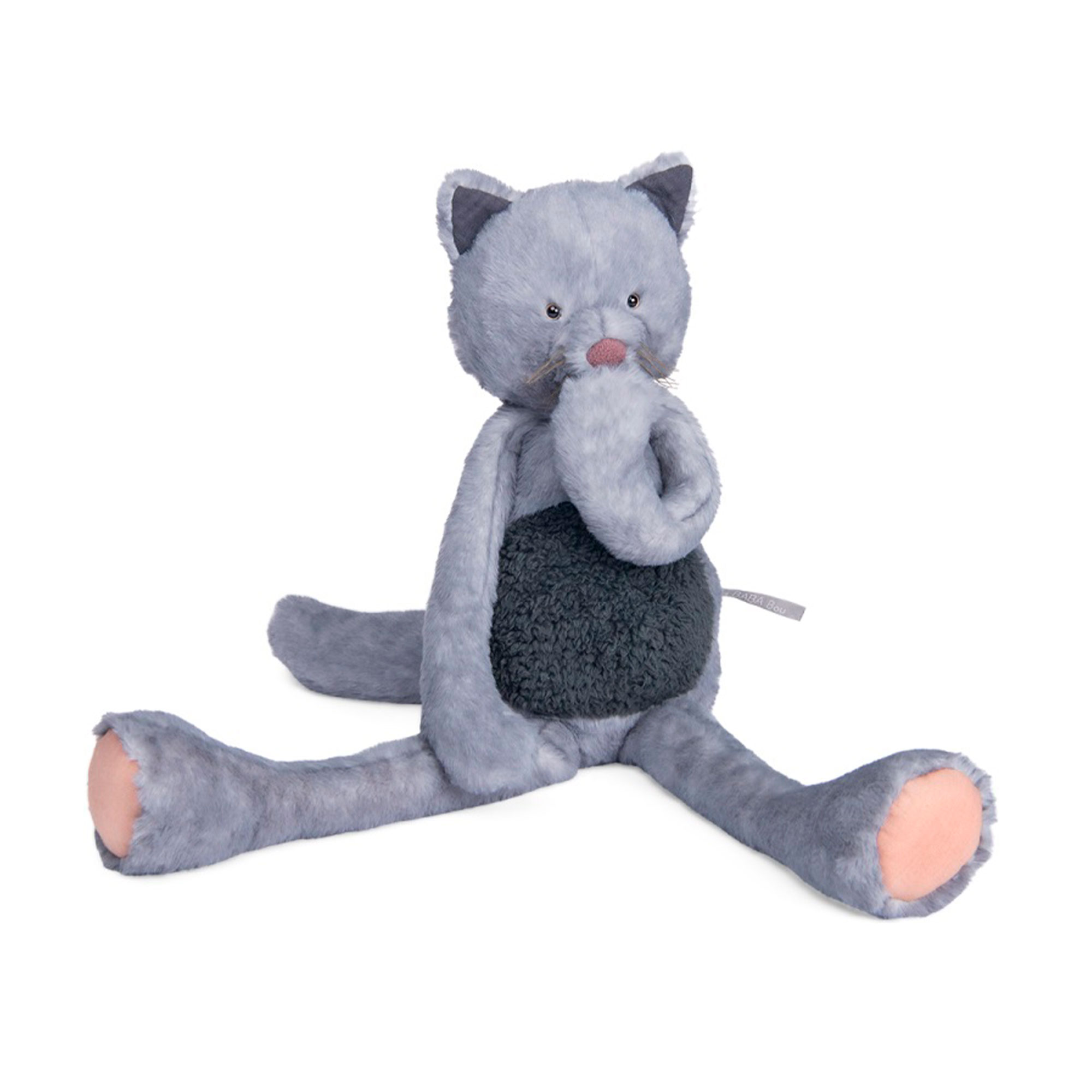 Patas largas y fáciles de atrapar, cuerpo flexible y pelaje texturizado de color azul grisáceo, este es el gran felino del Baba-bou. Este compañero de suave pelaje será sin duda el mejor aliado del bebé para seguirlo en todas sus aventuras.