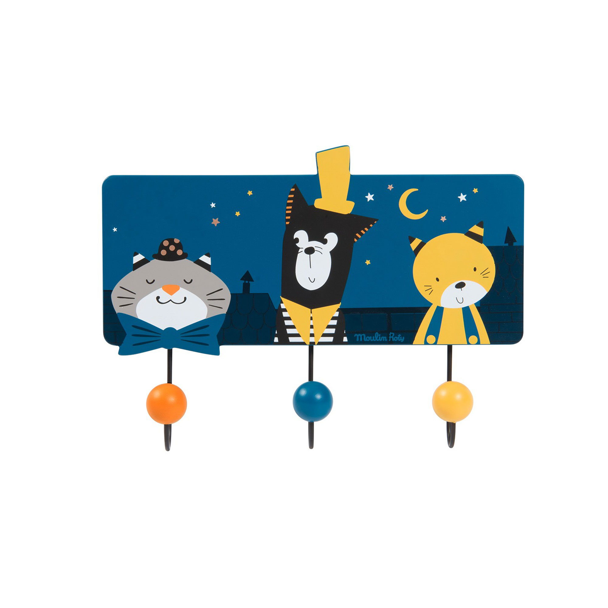 Aquí están nuestros tres amigos gatitos de la colección Les Mustaches de Moulin Roty reunidos en este encantador perchero. Con sus tres ganchos redondos en cobre, azul medianoche y amarillo mostaza y su montante de madera, será un magnífico elemento decorativo en la habitación de tu hijo, además de ser útil para colgar el abrigo después del colegio. Las poéticas y delicadas ilustraciones de una noche estrellada sobre los tejados de la ciudad combinan con el resto de elementos de la misma colección. Encuentra todos los juguetes y objetos de decoración sobre esta original temática de los gatitos dandy.