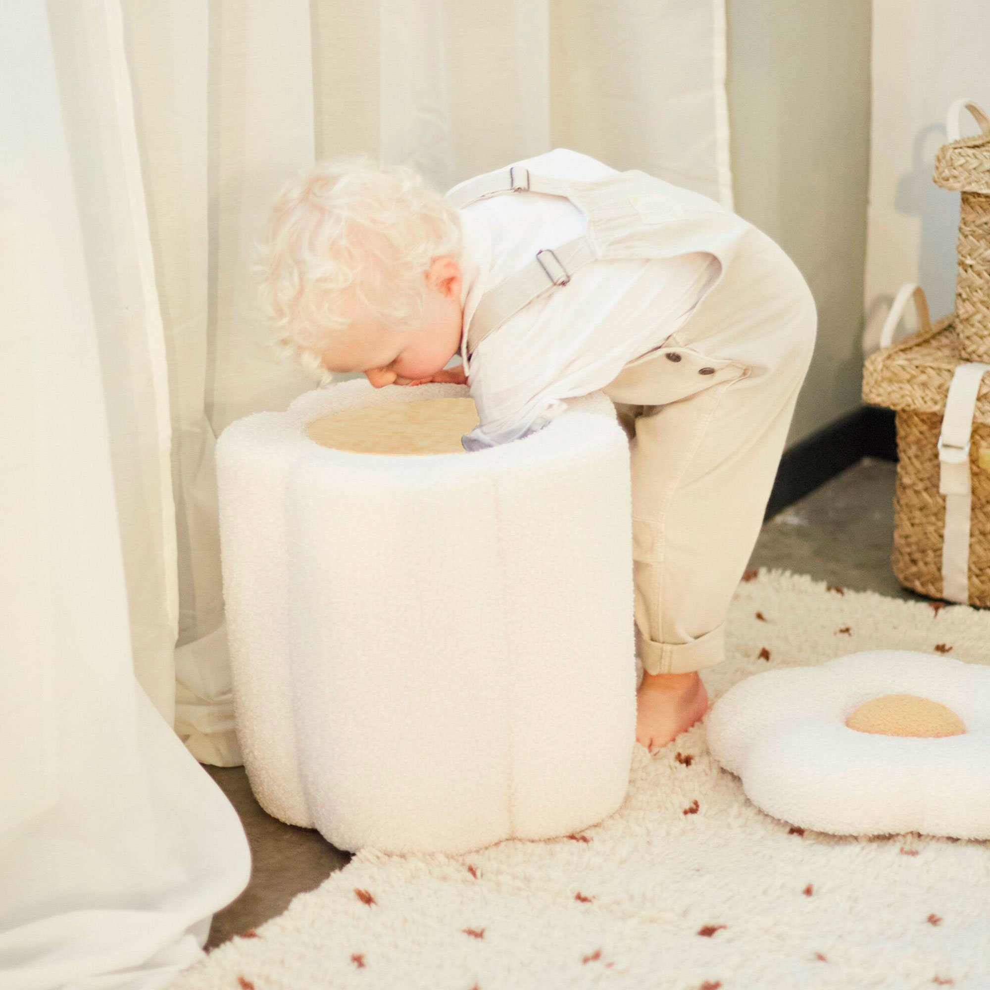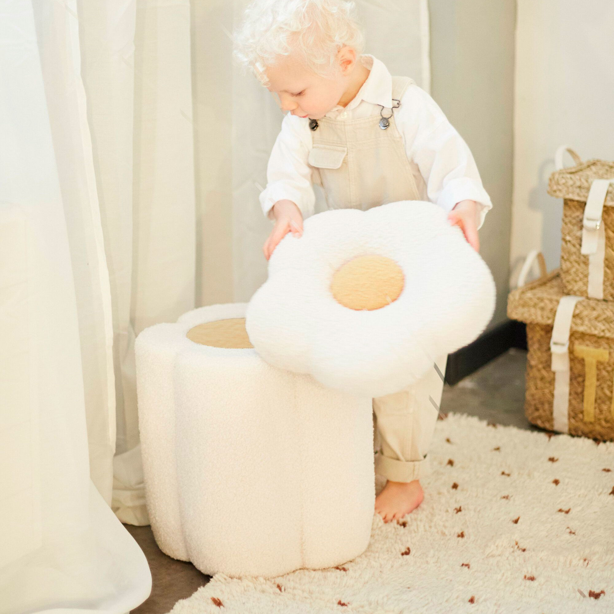 Este hermoso puf con forma de flor también se puede usar como caja de juguetes. Está hecho con un moderno osito de peluche en color blanco roto y un osito de peluche en color amarillo claro en el centro.