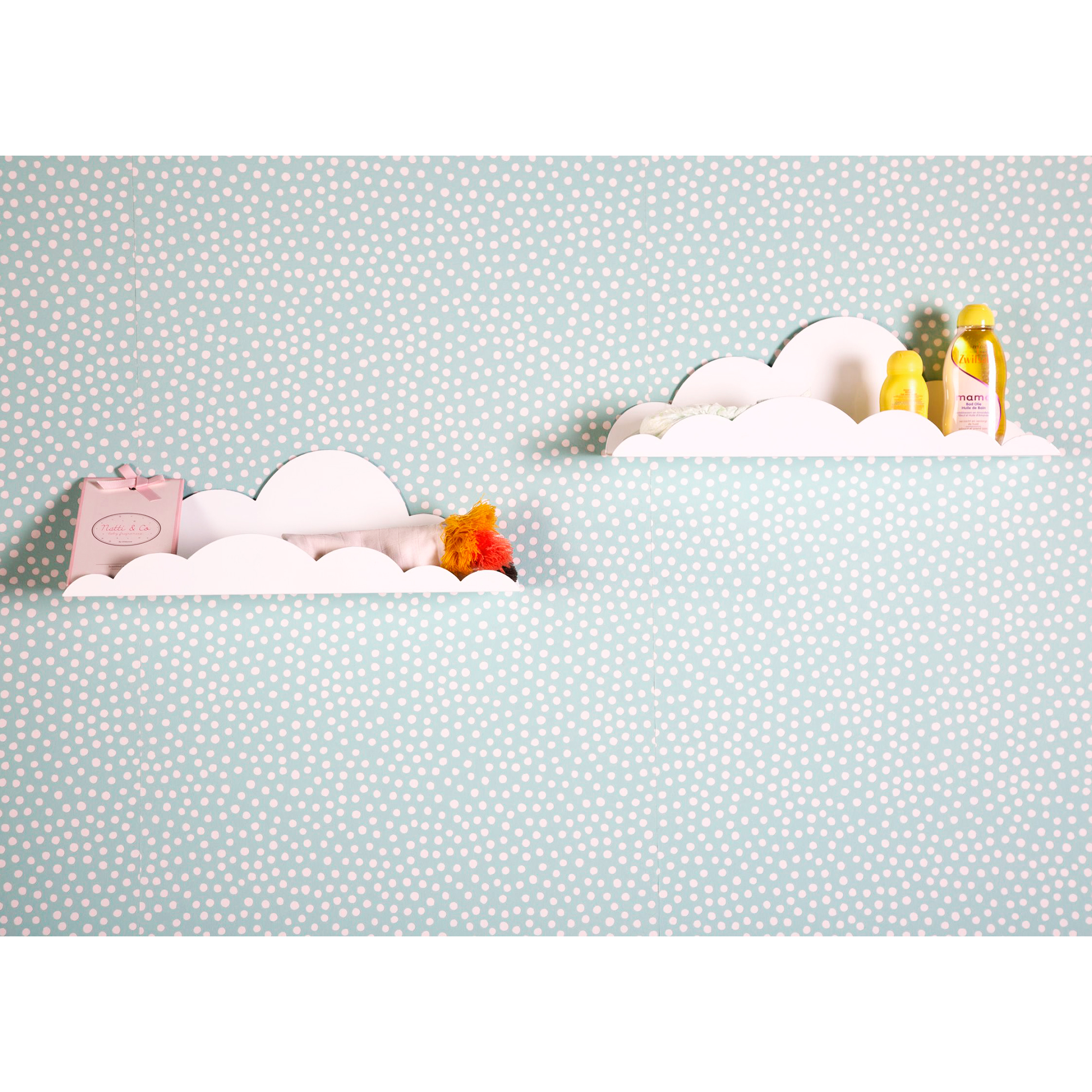 Muestra algunos artículos divertidos de tu pequeño en este hermoso estante de pared. El estante de pared tiene forma de nube y le da a la guardería un aspecto único y de ensueño.