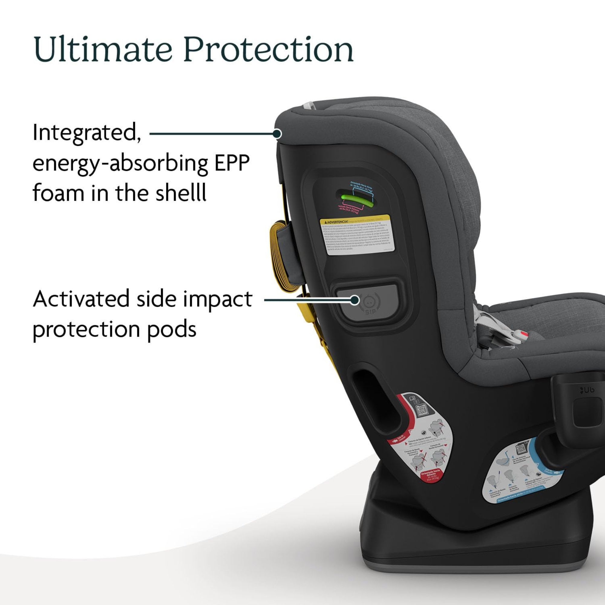 - ATA MEJOR Y DISPERSIÓN DE IMPACTO: la correa multidireccional reduce la rotación del asiento y la tensión en la cabeza y el cuello del niño durante el impacto. La espuma EPP entre la carcasa interior y exterior absorbe las fuerzas en el asiento en lugar del niño