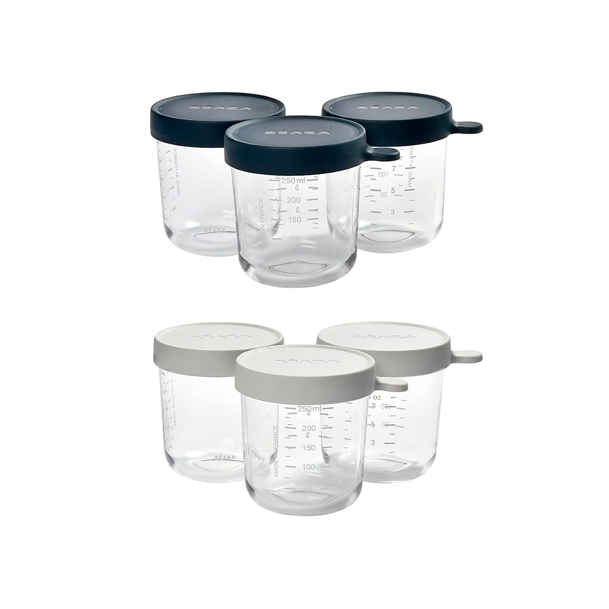 - Contenido: 1 Set de 6 frascos de vidrio para Comida de Bebé y Niños 250 ml, color Azul Oscuro/Niebla Ligera