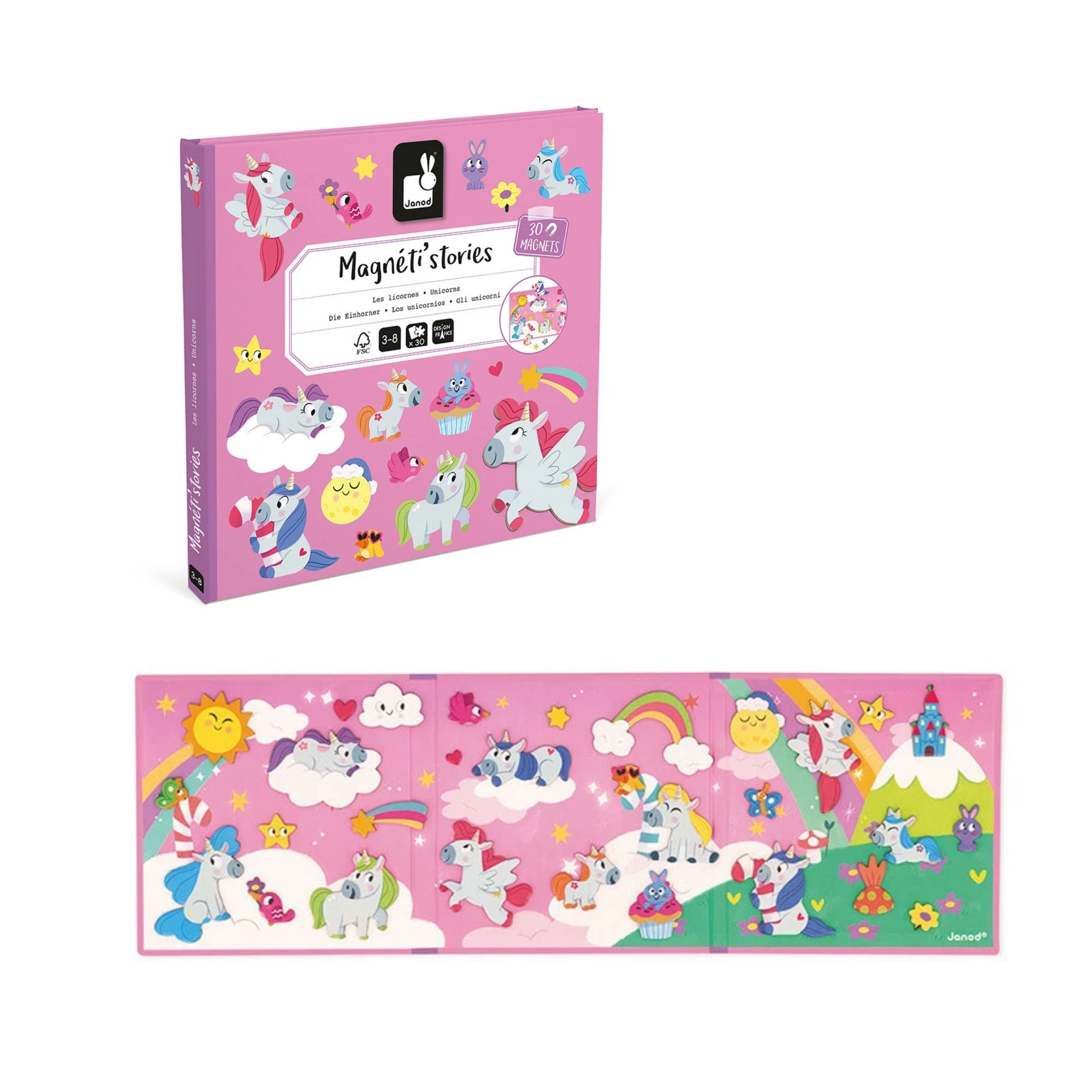 El panorama magnético, práctico y plegable, puede ir a cualquier parte con el niño, guardado en su mochila. Este juego magnético protagonizado por los unicornios forma parte de la gran colección de Magnéti’stories, auténticas invitaciones a la imaginación y a la ensoñación. Juego magnético fabricado con cartón con certificado FSC™ y materiales homologados.