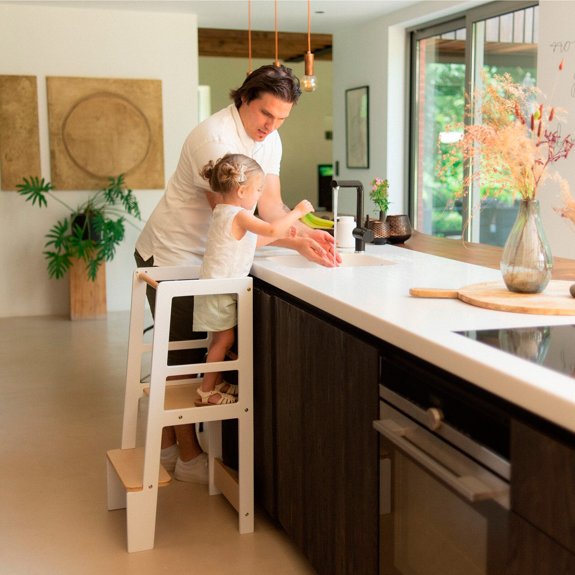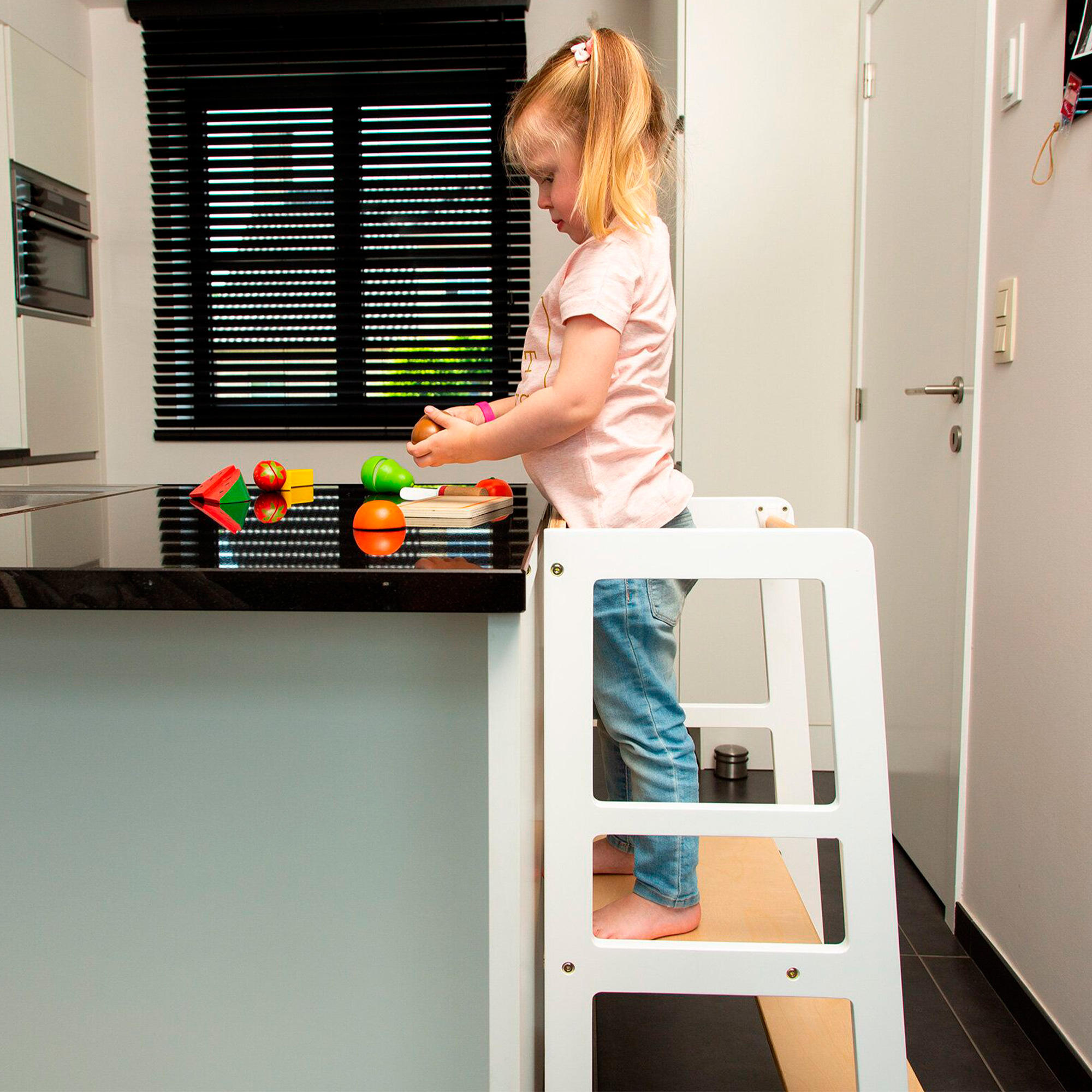 La torre de aprendizaje es un tipo de taburete seguro al que los niños pueden subir y bajar solos. Úselo en la cocina para que su hijo le observe o le ayude a preparar la comida. También es útil en el baño usarlo en el lavabo para cepillarse los dientes o lavarse las manos.