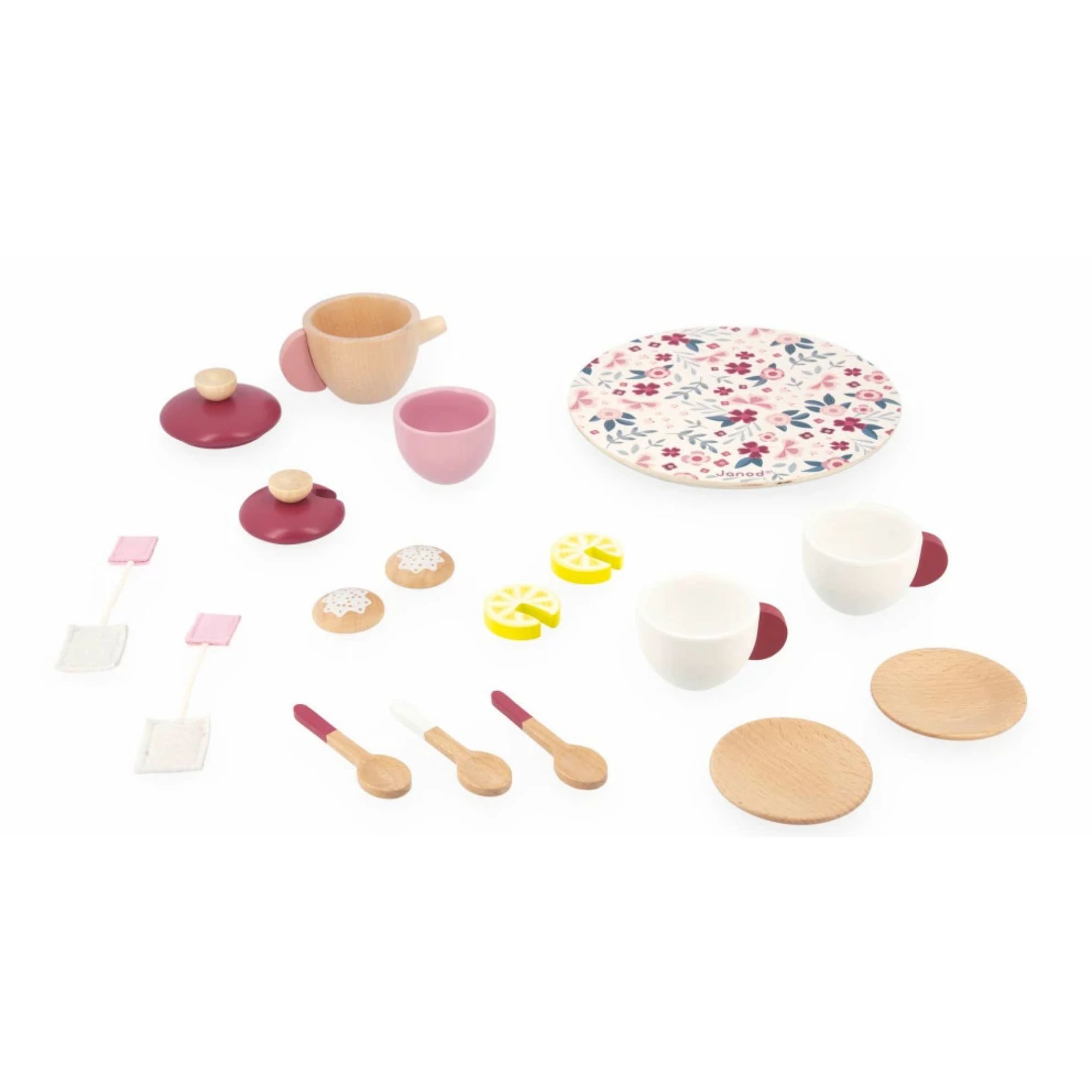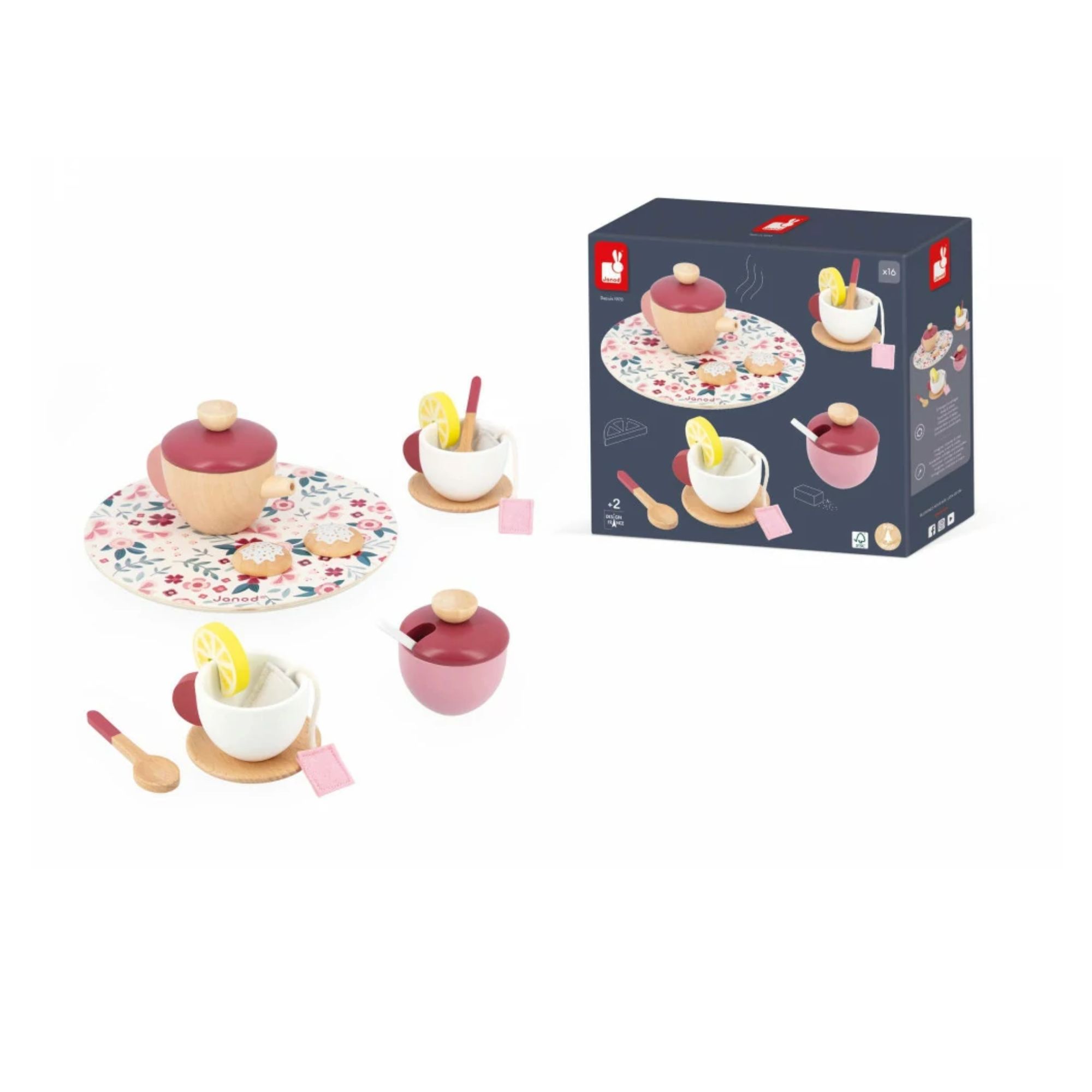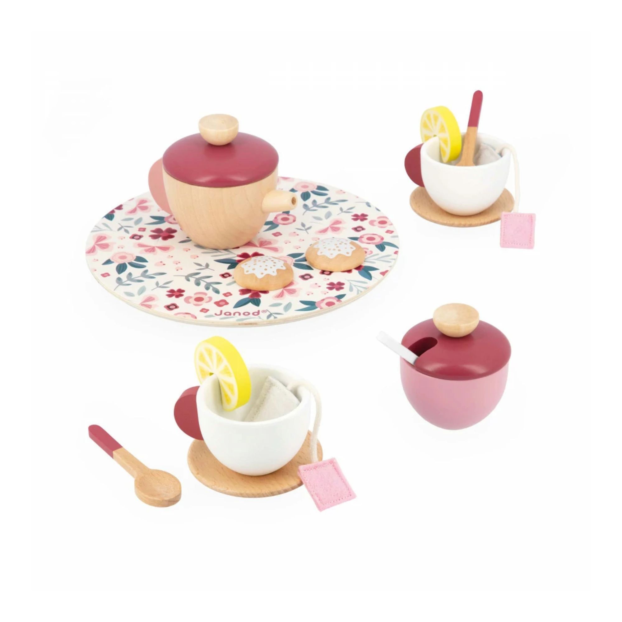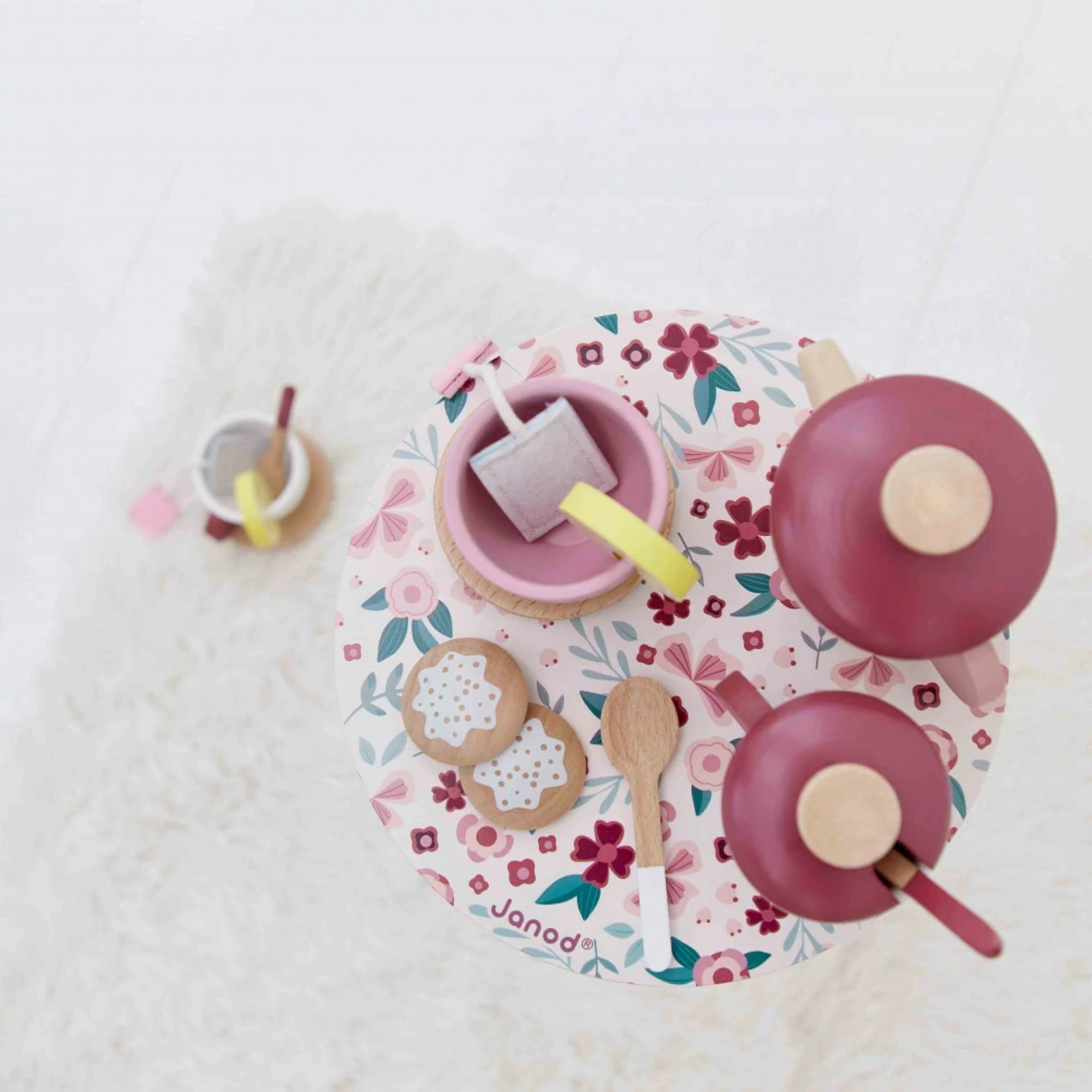 ¡Con este servicio de té de madera se te hará la boca agua! ¡Tiene todo lo necesario para preparar una sofisticada y refinada merienda para dos! Este juego de imitación adornado con ilustraciones de flores para niños a partir de 2 años es superoriginal. Consta de una tetera de madera natural realzada con unos deliciosos colores rosas, un azucarero a juego, dos tazas preparadas para poner dentro las bolsitas de té de fieltro, dos cucharitas y unas rodajas de limón que se sujetan a las tazas.